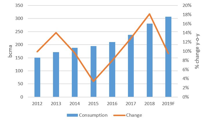 China’s gas demand growth has risen steadily – and rapidly – in recent years. There was particularly strong growth in 2017 and 2018 as the government’s coal-to-gas switching programme drove demand higher. In 2019, however, it looks as if demand growth has eased significantly with some estimates suggesting that it has fallen below 10%. With much of the global gas industry focused on China’s demand growth, these changes have had knock-on effects on LNG and pipeline projects and volumes around the world.
