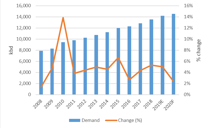 The short-term – 2020 – however is looking a lot less certain. Gas demand in China has risen steadily over the last twenty years, and at very high rates more recently because of supportive government policies. But 2019 saw a slackening of that growth, down to an estimated 9% according to Sinopec, reflecting a weaker Chinese economy, less supportive government policies, US-China trade tensions and slow gas sector reform. 2020 is unlikely to break this trend.