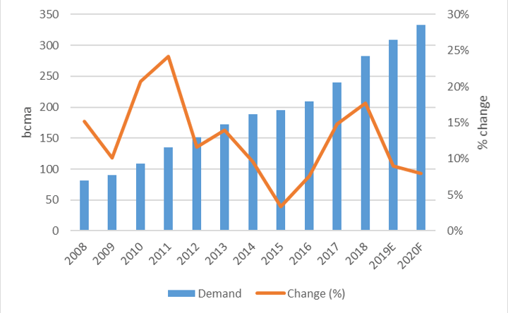 Sinopec has recently suggested that the Chinese gas market will be oversupplied in 2020. Overall gas supply (production and imports) is forecast to rise by 8.9% to 335 bcma this year. Demand, however, will rise by just 8.8% to 329 bcma – with the slowdown being largely the result of the decreased government emphasis on the coal-to-gas switching programme.