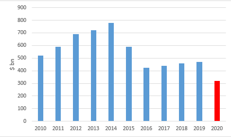 - Total energy investment will fall by 20% in 2020 because of Covid-19, from $1.9 bn to $1.5 bn