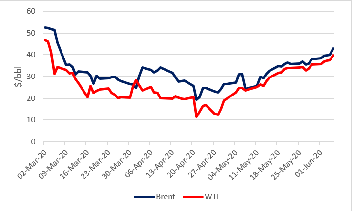 Prices have recovered to more than $40/bbl after plumbing lows back in late April when the expiry of the May WTI contract during the Saudi-Russia price war briefly sent them negative. Since then – initially on the back of production cuts by OPEC+ and non-OPEC countries but latterly driven by the reopening of national economies – they have been on an uptrend: over the past week Brent is up $5/bbl and WTI $4.35/bbl on expectations that the agreement would be extended, at least into July (although the idling of more than 0.6 mbd of USGC production because of a hurricane also played a role). The price rises themselves of course also encouraged the producers to maintain their discipline because the cuts are having the desired effect.